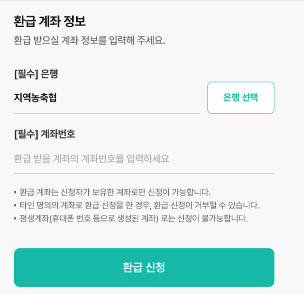 개인정보 인증이 됐으면, 환급계좌를 입력합니다. 입력 후 하단에 환급신청 클릭하면 끝.